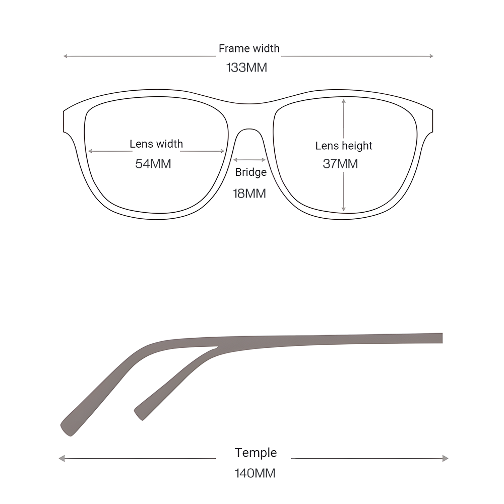 For example: 50-20-135. This means the lens width is 50mm, the bridge width is 20mm, and the temple length is 135mm.