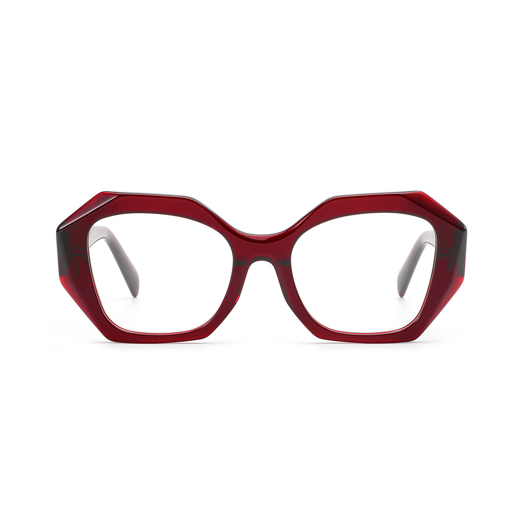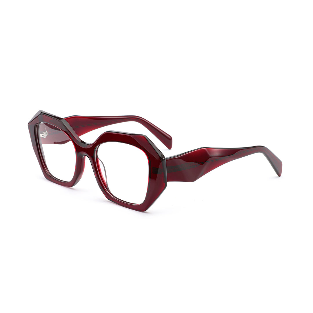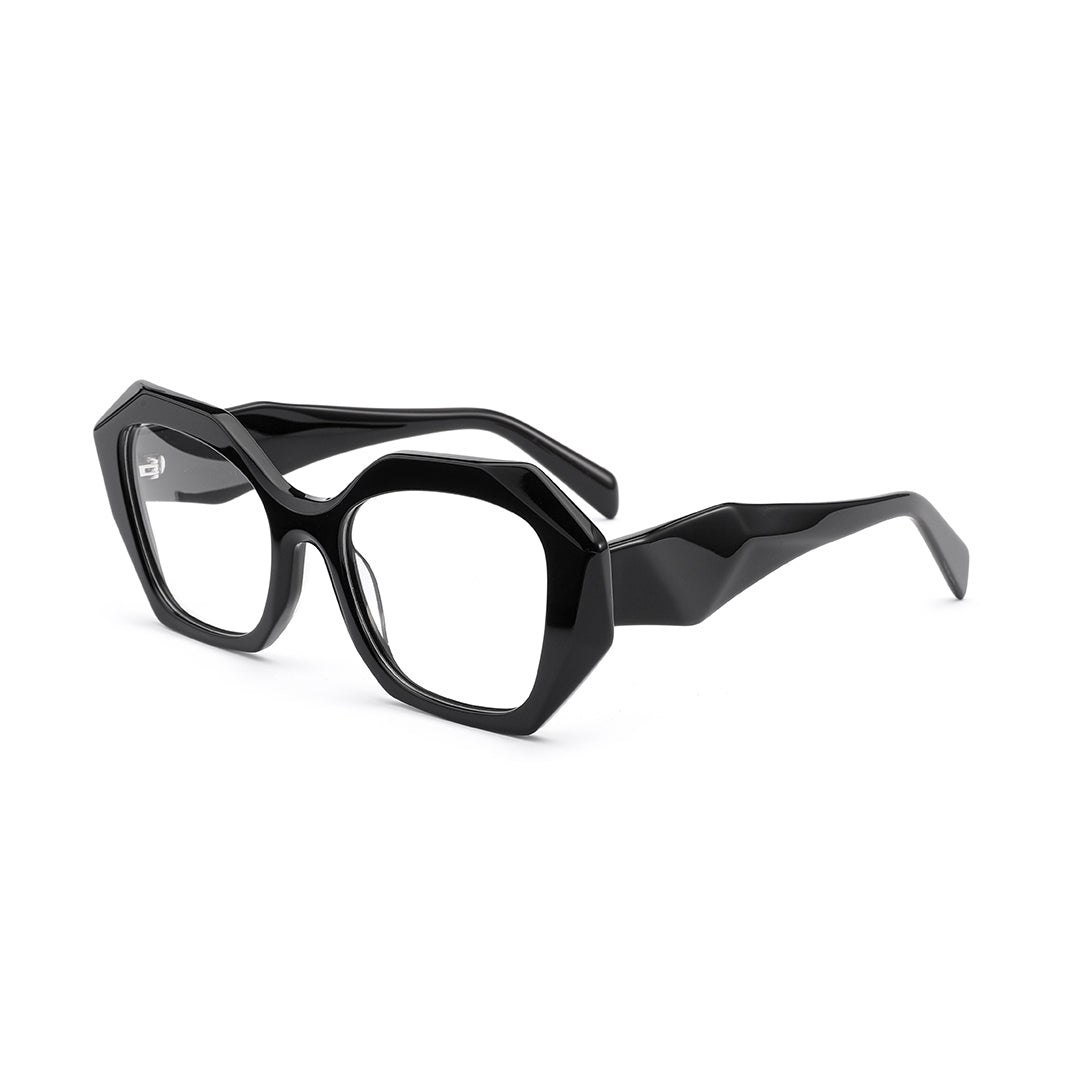 VALENCIA eyewear features a distinctive polygonal frame design that artfully breaks away from traditional contours, showcasing exceptional taste. The refined beveled details elevate the overall aesthetic while elegantly enhancing facial features and sculpting a refined silhouette, seamlessly blending fashion and functionality.